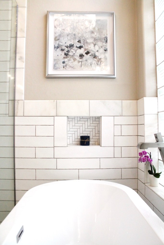 We were able to come up with a new floor plan that would enlarge the shower and add a new freestanding soaking tub. We shortened the double vanity slightly to make room for the new bathtub and also shifted the closet door’s location. The result is a beautiful, peaceful master bathroom.
