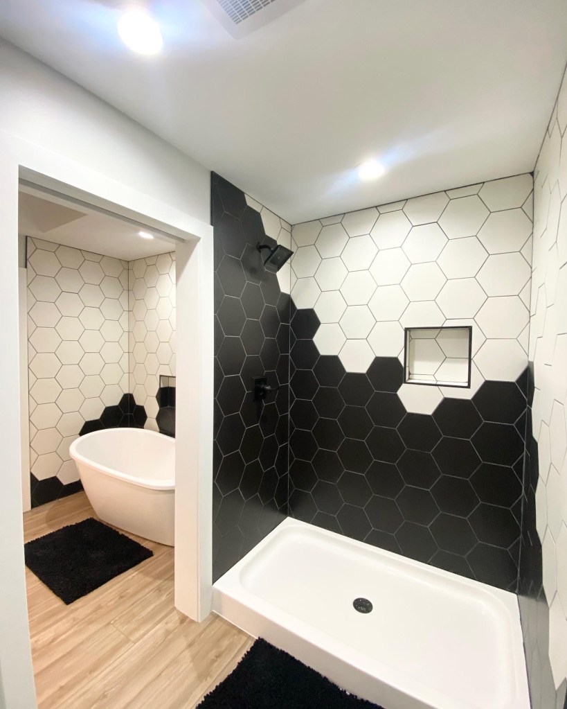 We came up with this pattern with black and white hexagon ceramic tiles, that created a build up from the one side that has the freestanding tub, continuing over to the other side of the bathroom where the walk in shower is. The result was this really playful design.