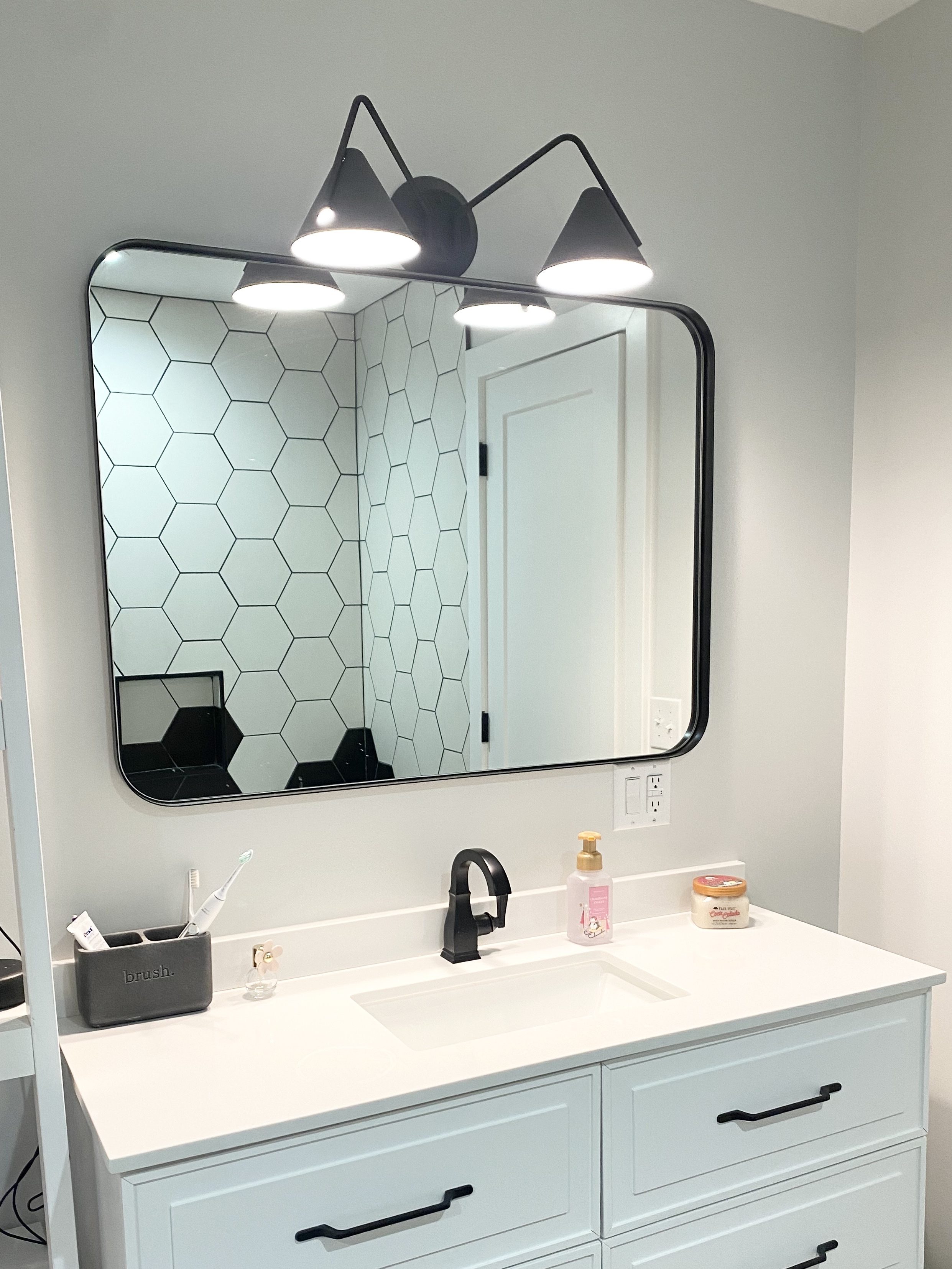 For the vanity, we continued the black & white color theme and finished out the space with all matte black fixtures and handles.