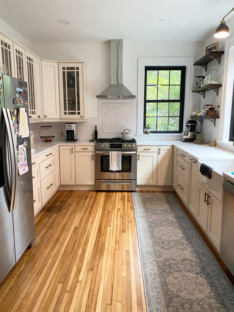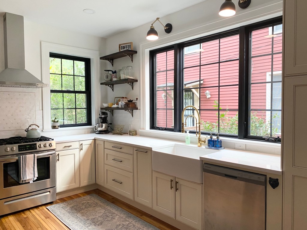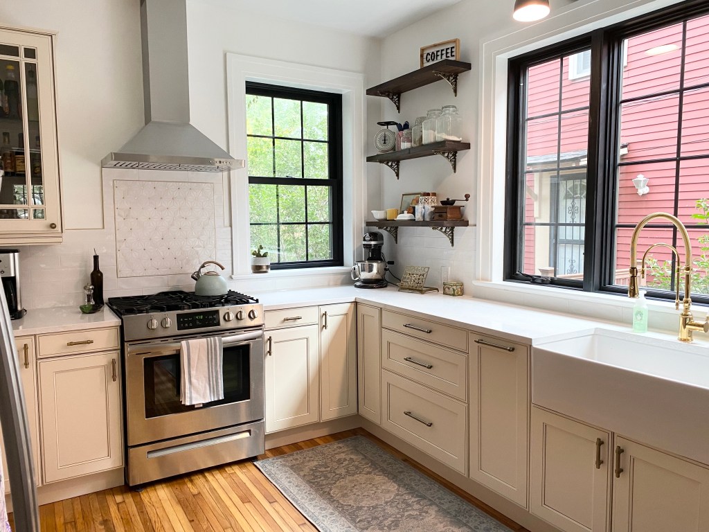 The original hardwood floors were sanded down and refinished, and all new cabinetry and countertops were installed in a subtle warm ivory linen color. We added brass hardware, swing arm pendant lights and two gorgeous black windows to let in the natural light.