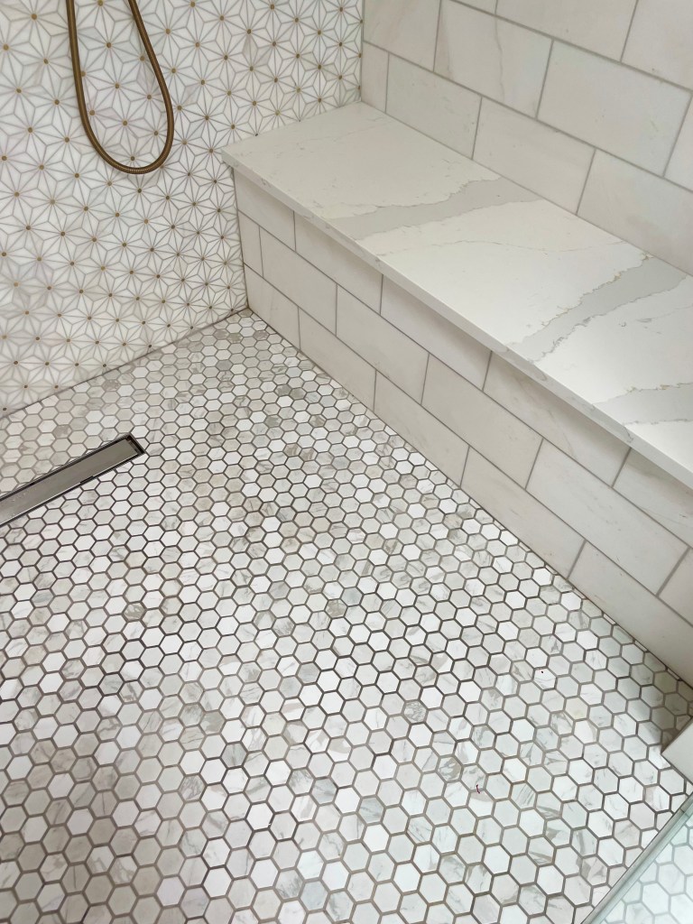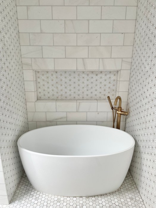 In the primary bathroom, we created a large walk in shower “wet room” with a gorgeous soaking tub complete with marble tiles.