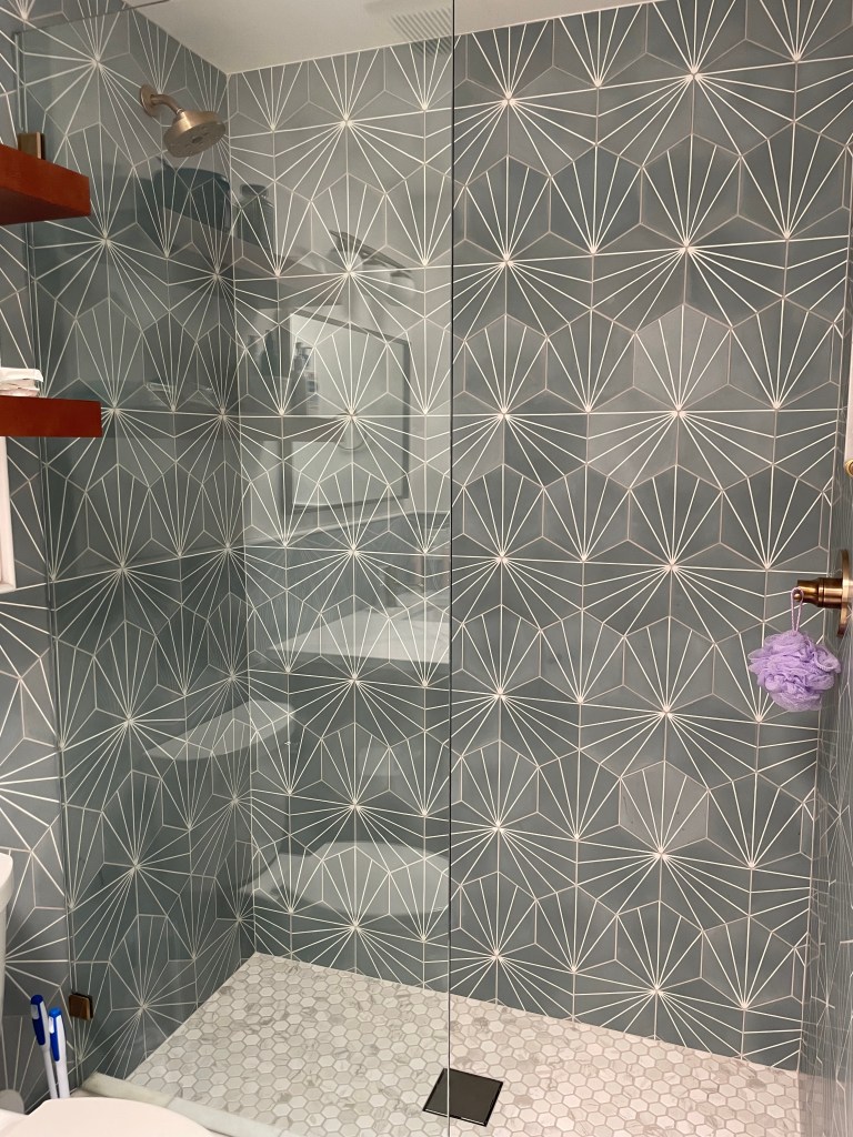 The second and third bathrooms continue the modern feel with hexagon concrete starburst wall tiles and marble flooring in a soft muted green.